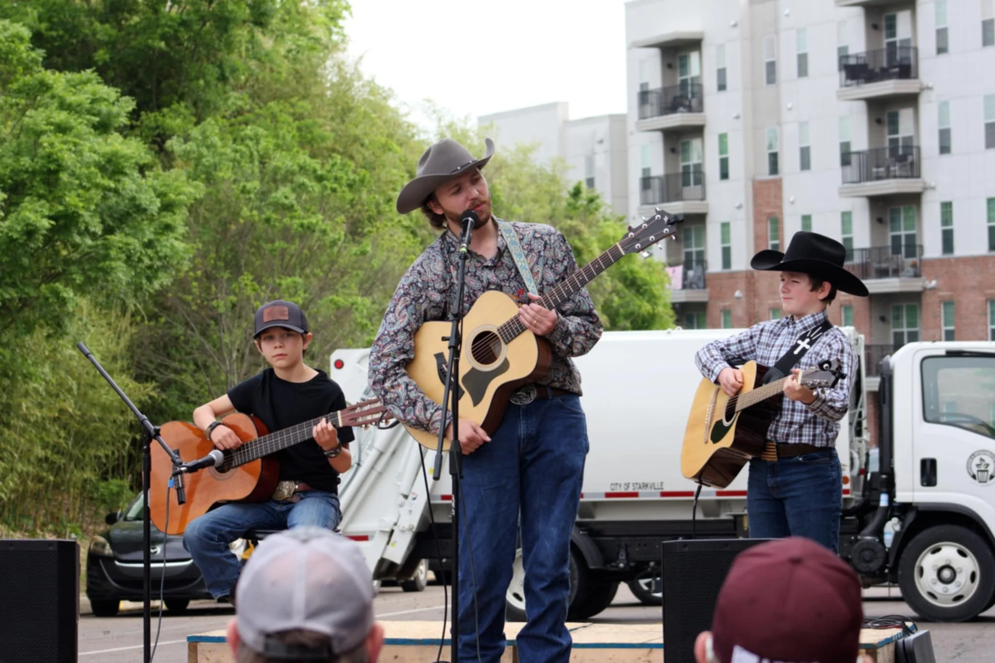 Joey and Wyatt playing guitar with Mason at Open Mic Munson And Brothers.